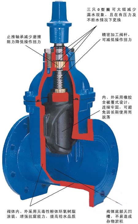 Elastic seating gate valve is also called soft sealing gate valve. Elastic seating gate valve adopts non-cavity structure. Epoxy resin is sprayed on the inner and outer surface of valve body cover and rubber is coated on the surface of gate plate. This fundamentally prevents the possibility of corrosion. The "O" sealing ring is used instead of filler in the stem seal to make bees more reliable. According to the requirement, the gate valve can be operated by operating lever, handwheel, electric and pneumatic.