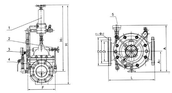 1, pilot valve 2, needle valve 3, ball valve 4, main valve 5, pressure gauge.
