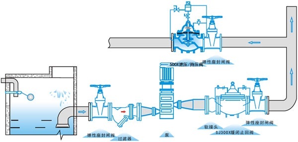 The 500X relief/holding valve consists of a main valve, a relief/holding valve needle valve, a ball valve, a microfilter and a pressure gauge to form a hydraulic control nozzle system. Using hydraulic automatic operation, it can be used as pressure relief valve and can also be used as holding valve. When used as relief valve, the water supply pressure can be maintained below the set safety value; when used as pressure holding valve, the upstream water pressure of the main valve can be maintained above the set value, and the upstream water supply pressure of the main valve can be maintained.
