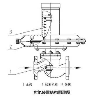 泄氮裝置結(jié)構(gòu)如右圖所示,該裝置采用內(nèi)反饋結(jié)構(gòu),介質(zhì)直接經(jīng)閥蓋進入檢測機構(gòu)(2),介質(zhì)在檢測元件上產(chǎn)生一個作用力與預設(shè)彈簧(3)預緊力相平衡。當罐內(nèi)壓力升高到高于泄氮裝置壓力設(shè)定點時,平衡被破壞,使閥芯(1)上移,打開閥門,向外界泄放氮氣;當罐內(nèi)壓力降到泄氮裝置壓力設(shè)定點時,由于預設(shè)彈簧力作用,關(guān)閉閥門。