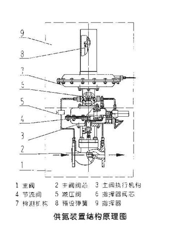 供氮裝置結(jié)構(gòu)如右圖所示,將設(shè)在罐頂?shù)娜狐c的介質(zhì)經(jīng)導壓管引入檢測機構(gòu)(7)、介質(zhì)在檢測元件上產(chǎn)生一個作用力與彈簧(8)、預緊力相平衡。當罐內(nèi)壓力降低到低于供氮裝置壓力設(shè)定點時,平衡被破壞,使指揮器閥芯(6)打開,從而使閥前氣體經(jīng)減壓閥(5)、節(jié)流閥(4)、進入主閥執(zhí)行機構(gòu)(3)上、下膜室,打主開閥閥芯(2)、向罐內(nèi)充注氮氣;當罐內(nèi)壓力升到供氮裝置壓力設(shè)定點時,由于預設(shè)彈簧力,關(guān)閉指揮器閥芯(6)又由于主閥執(zhí)行機構(gòu)中彈簧作用,關(guān)閉主閥,停止供氮。